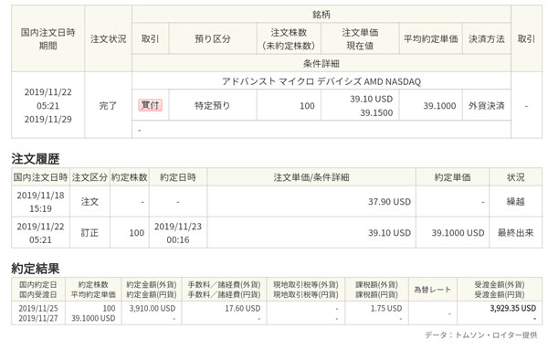 2019年11月23日(土)にナスダック上場の米国株アドバンスト・マイクロ・デバイシズ(AMD)を100株買付けました(20株買い増して保有数は120株)!