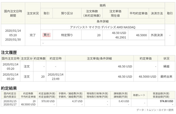 SBI証券で「48.50USD(米ドル)」で20株指値注文してたのが 2020年1月15日(水)に約定しました!
