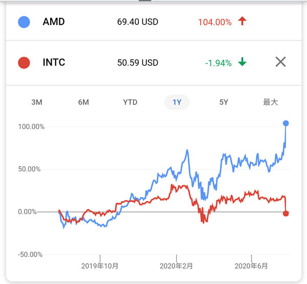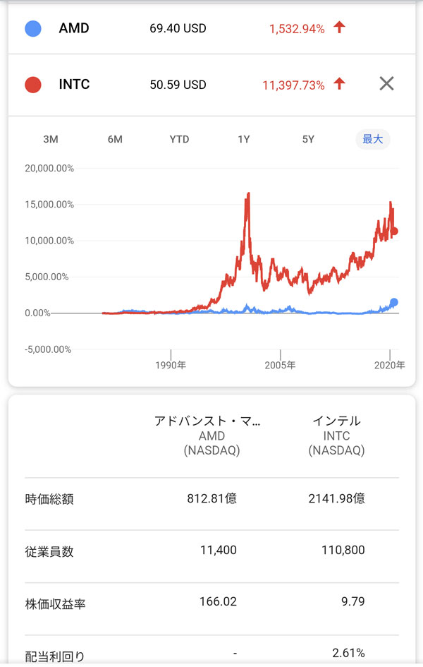 2020年発売予定のプレステーション5(PS5)、次世代Xbox(Xbox Series X)にもAMD製チップが搭載されるし、2020年7月25日現在の時価総額は以下の通りAMDはまだインテルの1/3。