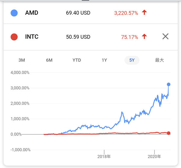 つまりインテル(INTC)と同業種、ライバルに当たるわけだけど、インテルよりも低価&高性能なCPU、GPUを製造、販売して業績は絶好調!