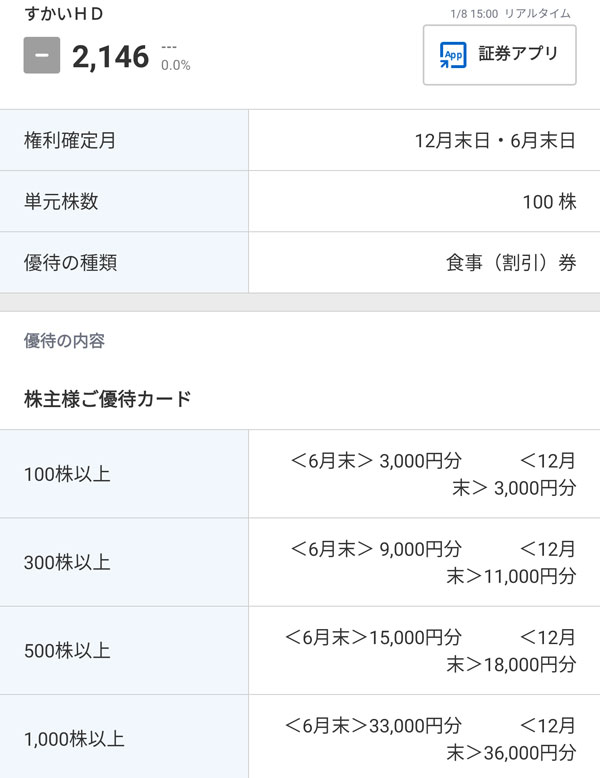 ただ、すかいらーくHD(3197)の株主優待は、すかいらーくグループをよく利用する人にとっては魅力的なのは間違いないし、今後も安定した業績が期待できるので今100株保有してるけど、もし株価が1,500円割ったら200株買い増して300株保有(年間2万円の株主様ご優待カード)にしたいなー。