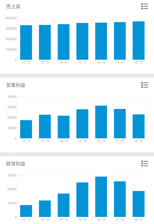すかいらーくHDの「売上、営業利益、経常利益」は以下の通りで、利益は下がってるけど(配当も2019年に減配・・・)、株価は順調に上がってます。