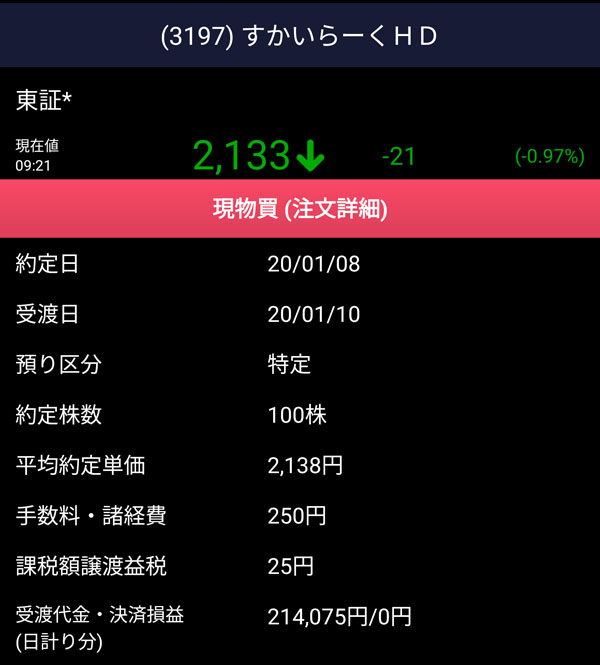 今回SBI証券で、すかいらーくHD(3197)を買った約定履歴です。