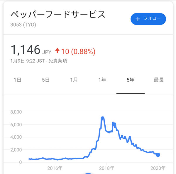 ペッパーフードサービス(3053)に至っては株価は最高値8,230円(2017年10月1日)⇒2020年1月9日の株価は1,146円と、最高値から80%以上も値下がりしてます(-。-;)
