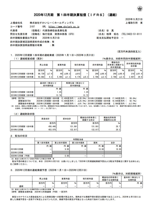 2020年5月21日(木)、すかいらーくHD(3197)が2020年第1四半期(1-3月)決算発表⇒8.1億円の赤字(税引前)⇒上期9円を計画していた配当見送り⇒下期配当未定に・・・。