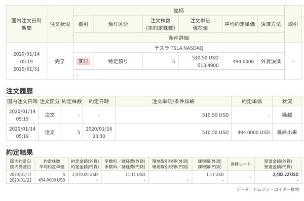 SBI証券で5株、指値注文してたテスラ(TSLA)が2020年1月16日(木)に約定!