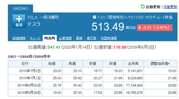 テスラ(TSLA)は2003年設立⇒2010年6月29日NASDAQ(ナスダック)へ上場し、公開価格(IPO)17ドル、初値19ドル、終値が23.89ドル。