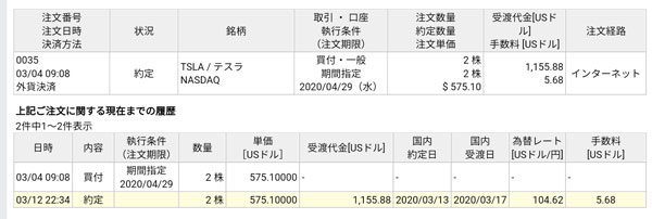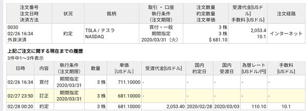 2020年2月末、新型肺炎コロナウイルスが世界的にパンデミック(世界的大流行)になる懸念が高まってきたため?NYダウ、ナスダック、S&P500の主要3指数とも1週間で10%ほど急落し、一時917ドルを突破したテスラ(TSLA)も最高値から1週間で30%近く急落したので、楽天証券で指値注文してた3株が約定しました!