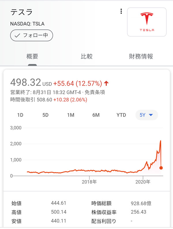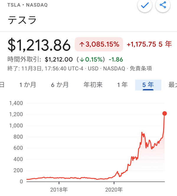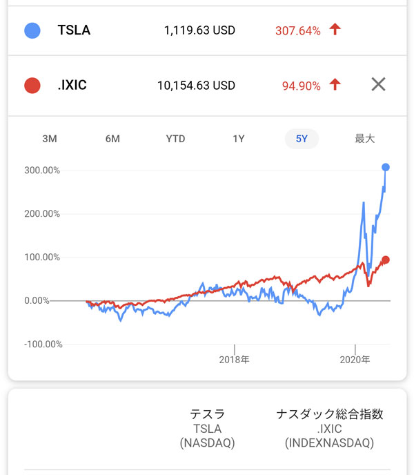 上場時にテスラ(TSLA)買って10年以上ガチホしてた奴なんて関係者以外いないと思うけど・・・、1年前の2019年5月(株価200ドルくらい)に買ってガチホしてても5倍超!