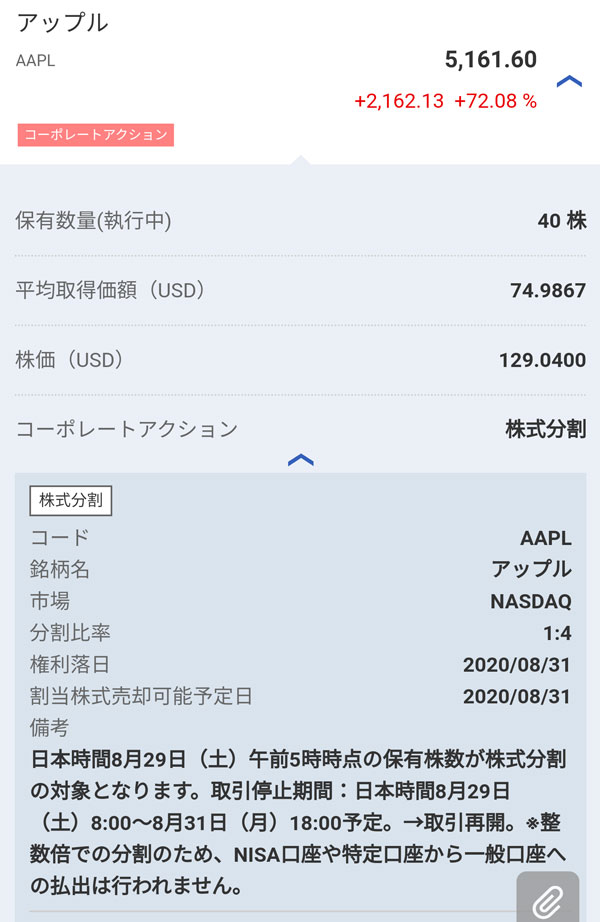 アップル(AAPL)も同日、1株⇒4株に株式分割し、僕は30株保有してたから120株(SBI証券80株+楽天証券40株)になりました。