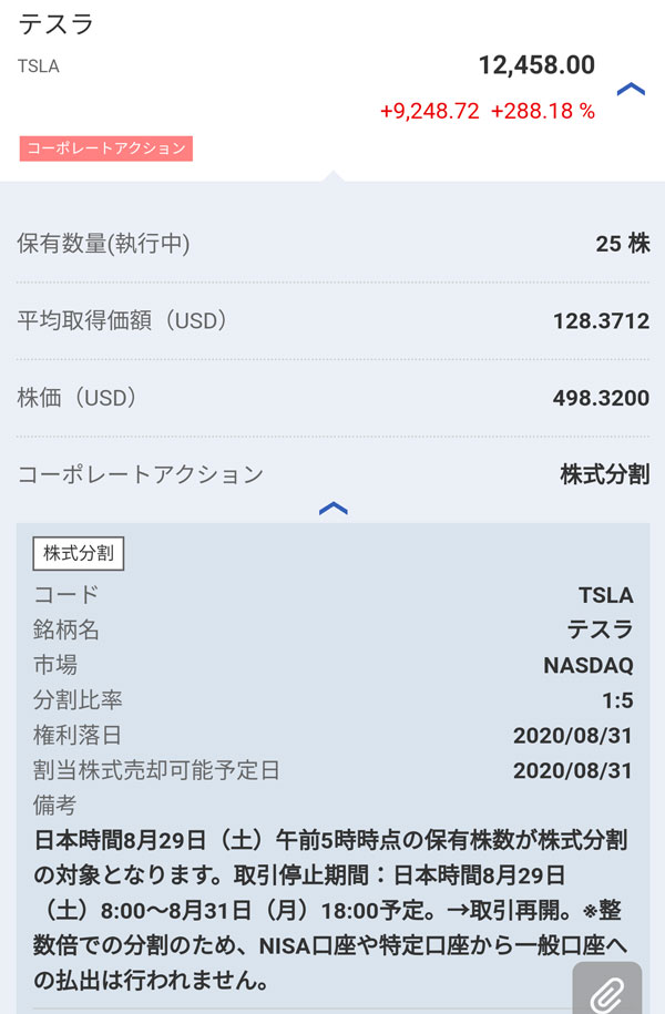 2020年8月31日(権利落ち日)にテスラ(TSLA)が1株⇒5株に株式分割し、僕は10株保有してたから50株(SBI証券25株+楽天証券25株)になりました。