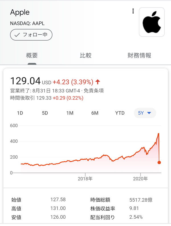 株価は1/4だから499.2ドル(2020年8月29日終値)⇒127.5ドル(2020年8月31日始値)に。