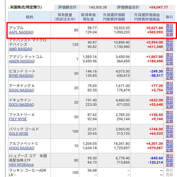 アップル(AAPL)株式分割⇒保有数量、平均約定単価