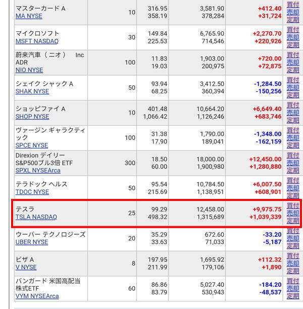 S&P500、NASDAQのインデックスファンド、ETFを4,000万超保有してて、S&P500、NASDAQにはテスラ(TSLA)も組み入れられてるからこれ以上の買い増し予定はないけど2030年頃まではガチホ!