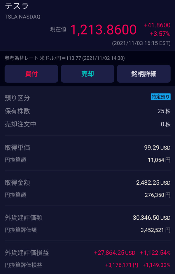 最初に買ったのが約1年10ヶ月前の2020年1月16日(木)、そこから2回買い増し⇒株式分割を経て50株ガチホ中のテスラ(TSLA)が2021年11月初旬にテンバガー(10倍)達成!