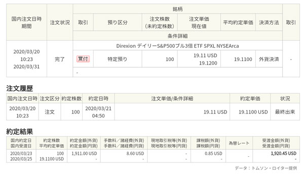 | 2020/3/20(金) | 100株 | 19.11USD | |||
