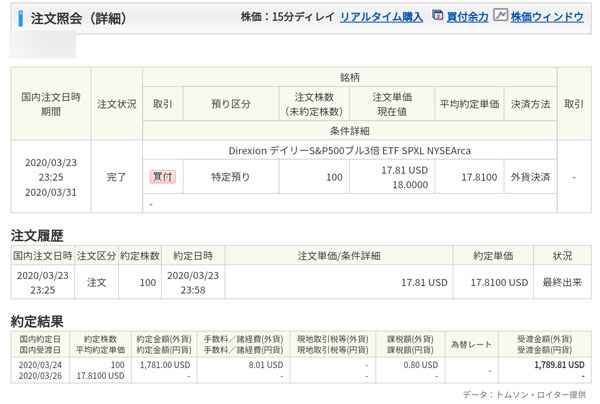 SPXL(S&P500ブル3倍ETF)を底打ちまで買ってきます(`・ω・´)