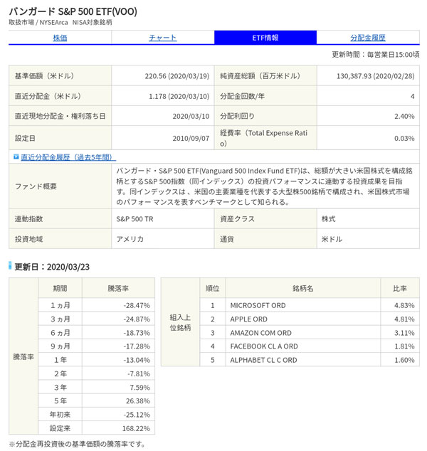 VOO(バンガード・S&P500ETF)の経費率&騰落率