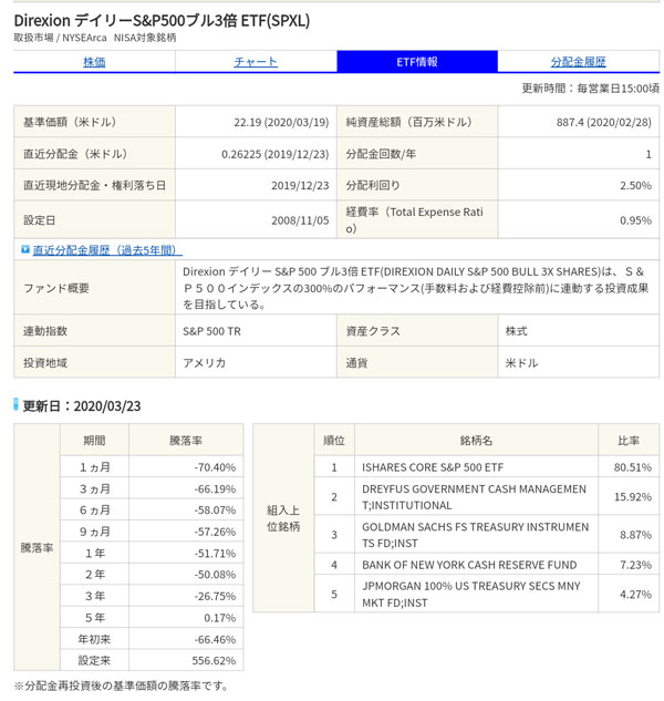 コロナショック前にSPXL(S&P500ブル3倍ETF)買ってたら僅か1ヶ月で-77%だから多分メンタルやられてると思う( ̄▽ ̄;)