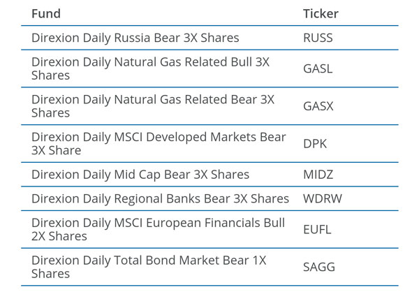 ただアメリカでもレバレッジ型商品への風当たりが強くなっており、さらにコロナショックによってマーケットが大荒れなのもあり、2020年3月23日にDirexion社は以下のレバレッジETFの倍率引き下げ、早期償還を発表しました。