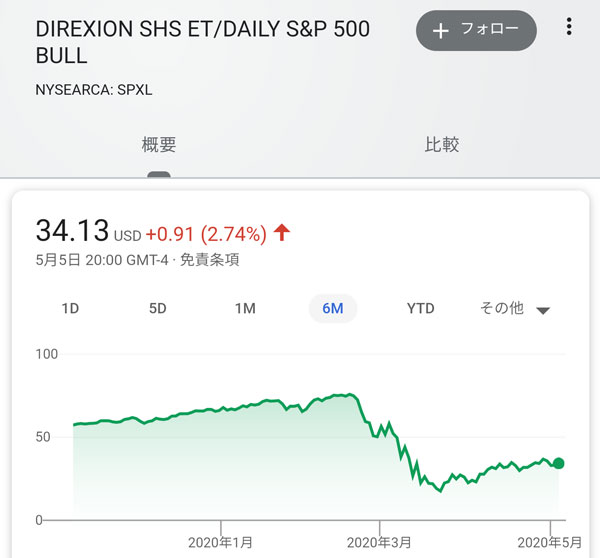 SPXLも2020年3月23日に約16.5ドルと直近最安値を付けてからあれよあれよと30ドルを突破し、僕は最安値付近(平均単価18.3USD)で400株買ってたから1ヶ月チョットで+90%になり含み益も約6,500ドル(約70万円)になってます(2020年5月6日現在)。