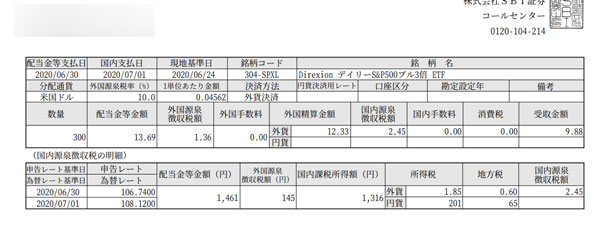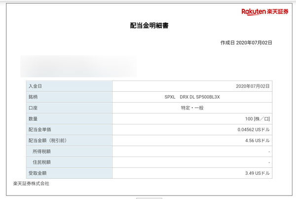 400株(SBI証券300株+楽天証券100株)保有中のSPXL(S&P500ブル3倍ETF)から入金された配当金履歴です。