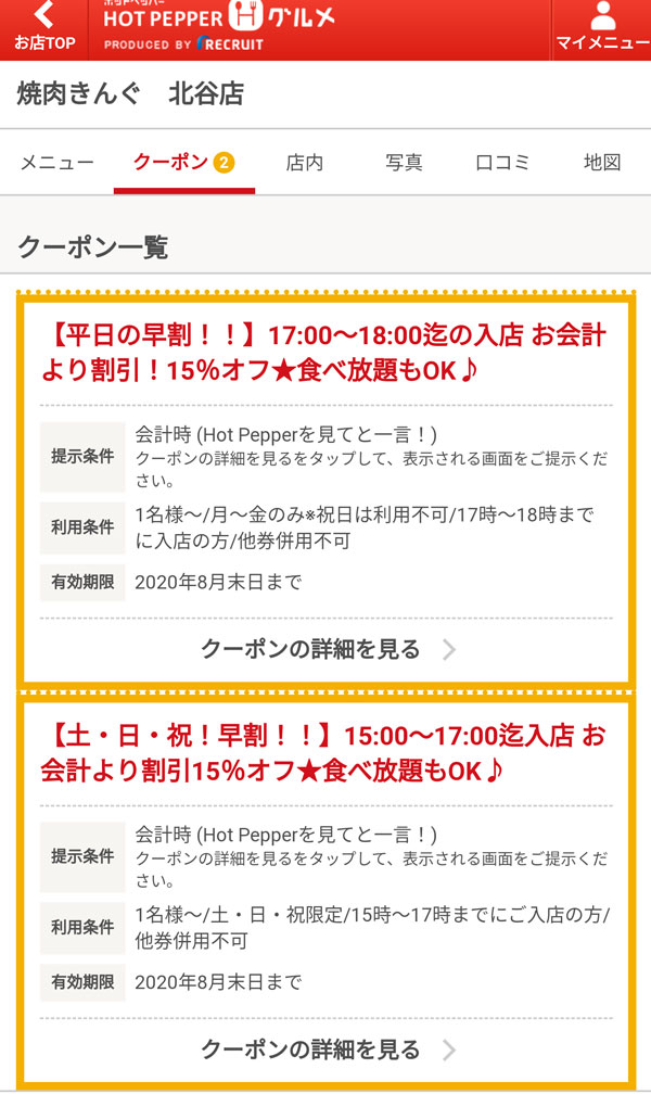 ホットペッパーグルメでもぐるなびとほぼ同じ内容の店舗限定クーポンを配布してます。