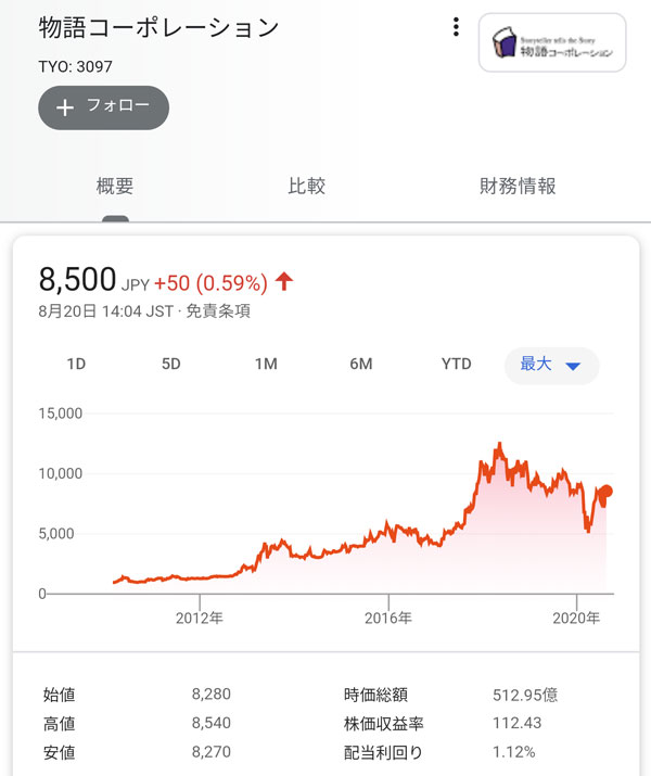 2020年8月20日現在の (株)物語コーポレーション(3097)の株価は約8,500円。
