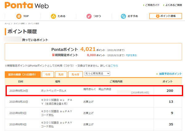 付与されるPontaポイントは来店日から6~10日後に付与されるようです(僕の場合5日後に付与されました)。