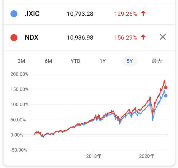 NASDAQ総合指数(+129%)vsNASDAQ100(+156%)直近5年の株価比較