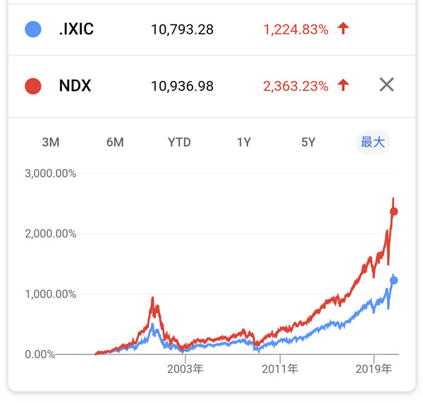 NASDAQ総合指数(+1,224%)vsNASDAQ100(+2,363%)直近約25年の株価比較