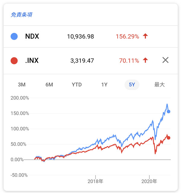 NASDAQ100(+156%)vsS&P500(+70%)直近5年の株価比較