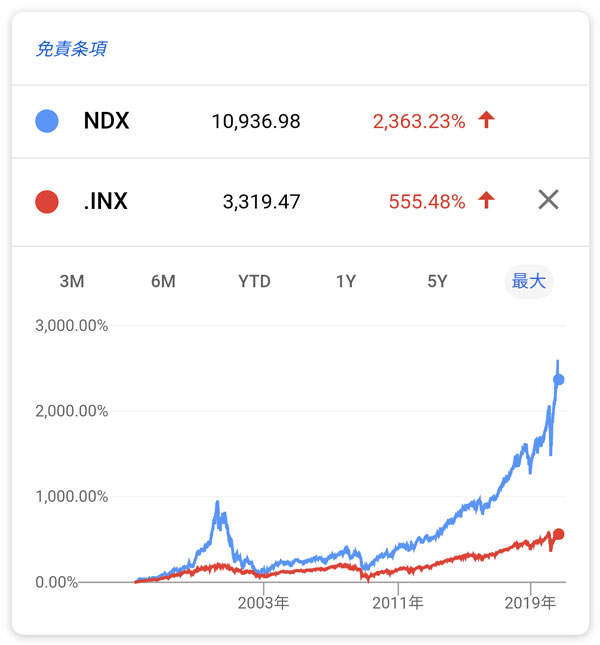 NASDAQ100(+2,363%)vsS&P500(+555%)直近25年の株価比較