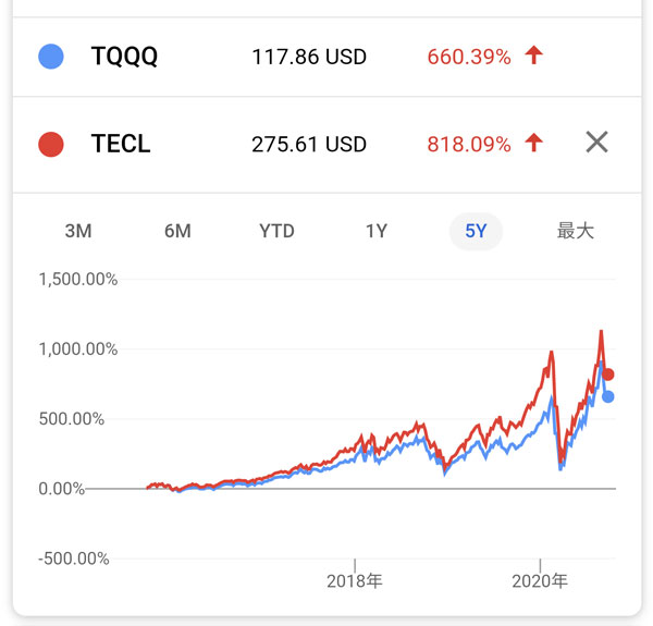 TQQQ(+660%)vsTECL(+818%)直近5年の株価比較