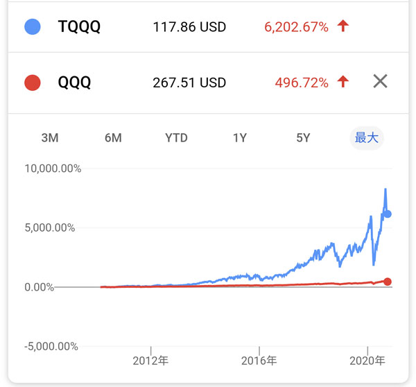 TQQQ(+6,200%)vsQQQ(+496%)過去約10年の株価比較