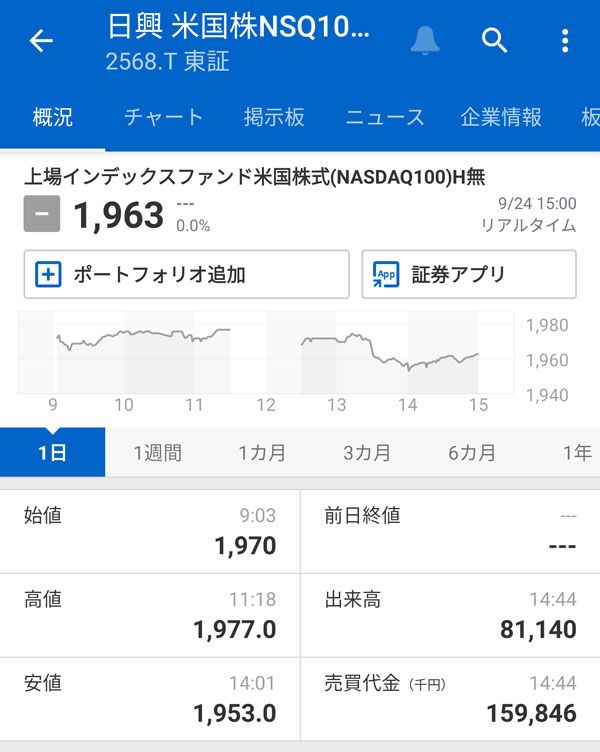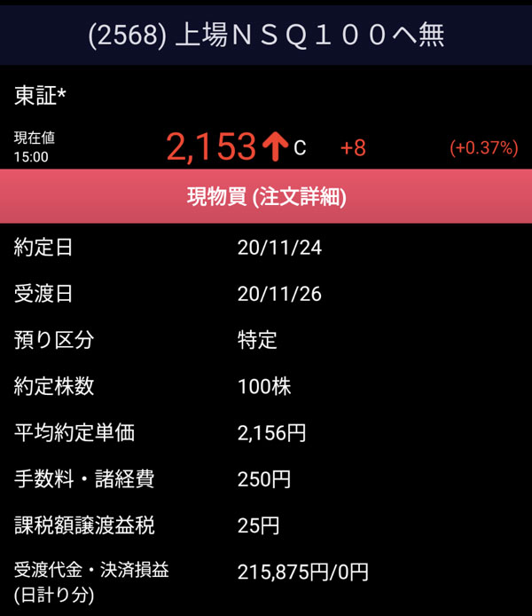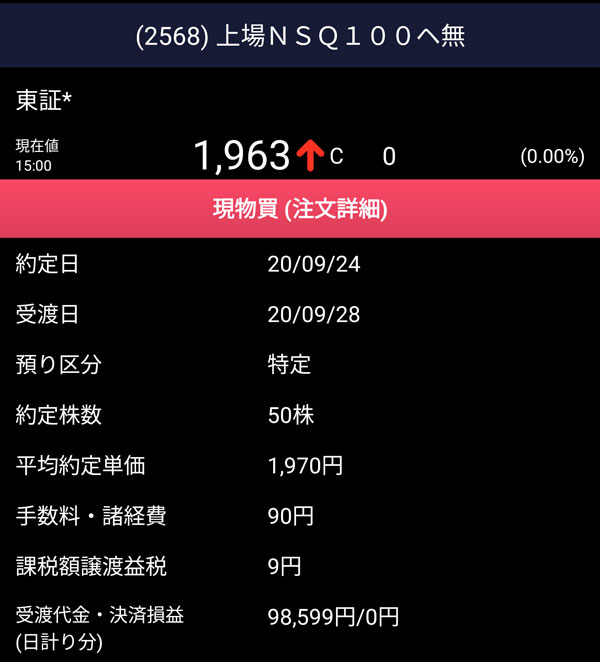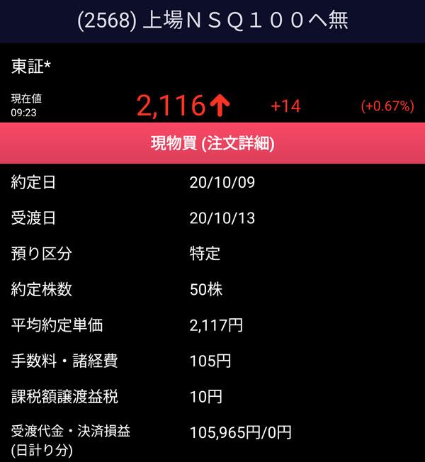 2020年9月24日(木)、東証に上場した上場インデックスファンド米国株式(NASDAQ100)H無(2568)を上場日にSBI証券で50株買いました!