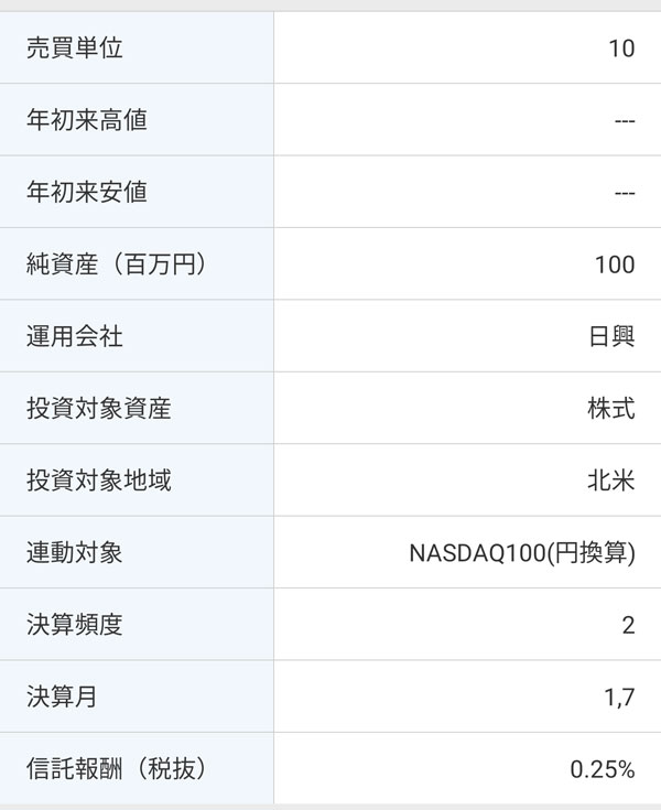 上場インデックスファンド米国株式(NASDAQ100)H無(2568) 0.275% 1億円(上場前)