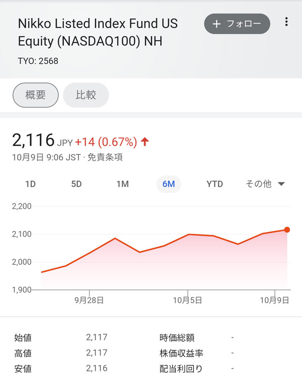 米国株式市場(NASDAQ/S&P500)は10月に入っても堅調で、2568の値動きはNASDAQ100との剥離はあまりない感じだから?今後もQQQ(NASDAQ100連動米国ETF)ではなく、2568を買い増していこうと思います。
