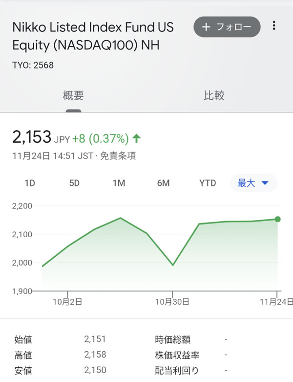 2020年11月24日(火)に上場インデックスファンド米国株式(NASDAQ100)H無(2568)を100株買い増して保有数量が200株になりました!