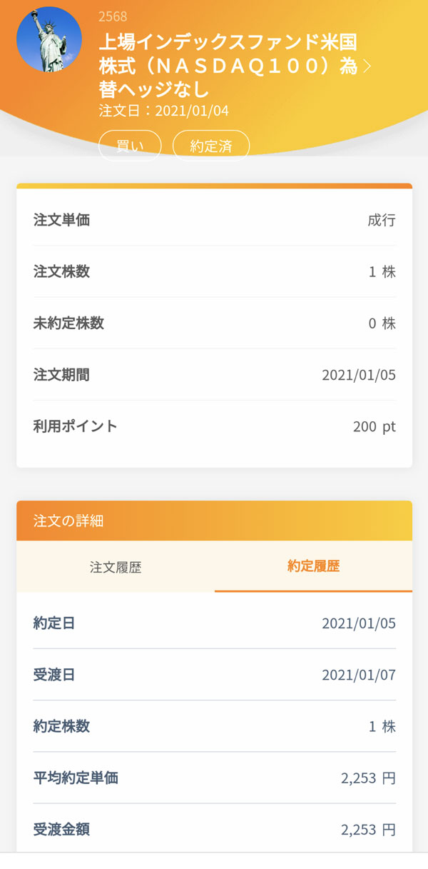 2021年1月5日(火)に上場インデックスファンド米国株式(NASDAQ100)H無(2568)を1株買い増して保有数量が201株になりました!