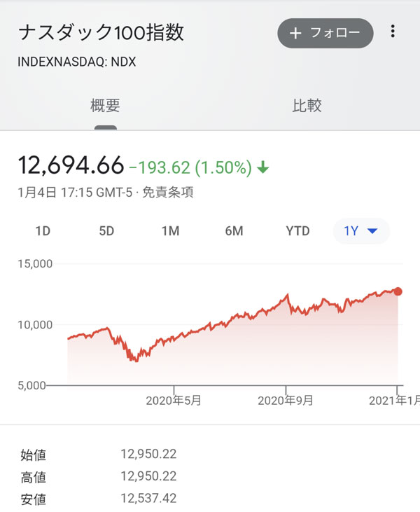 つまり現状、NASDAQ総合、NASDAQ100とも「AAPL/MSFT/AMZN/FB/GOOG/TSLA」などの株価次第ってことですね。