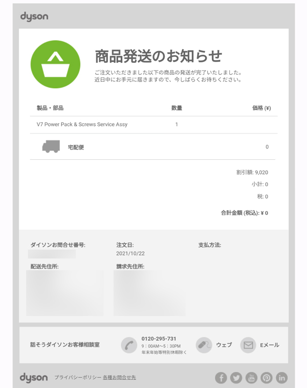僕の場合、2021年10月22日(金)にオンラインサポートへ連絡(僕はチャットを利用)翌日10月23日(土)発送10月24日(日)ヤマト運輸で自宅へ配送されました。