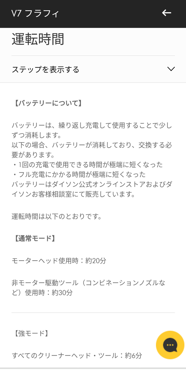 僕が使ってるダイソン掃除機はDyson V7 Fluffy SV11 FF2で以下のような症状でした(機種によって運転時間は異なります)。