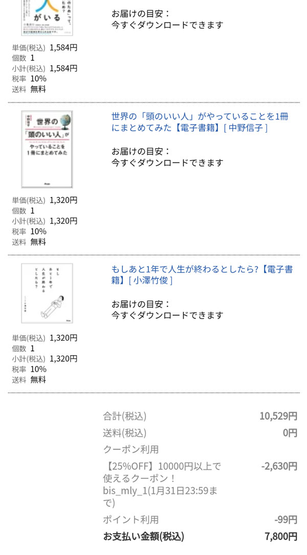電子書籍は紙書籍より少し安いこと多いんだけど、楽天koboの場合さらに5000円以上で20%引き、1万円以上で25%引きクーポンとかあるので、1万円購入すれば2,500円引き、つまり2、3冊分無料みたいな感じです。
