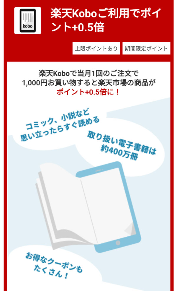 楽天SPUも日に日に改悪してて・・・、楽天koboは月1,000円以上購入で+0.5%、つまり楽天で月10万円買い物しても500pt付与されるだけだからSPU(+0.5%)目的で楽天koboで買うことはないけど。。