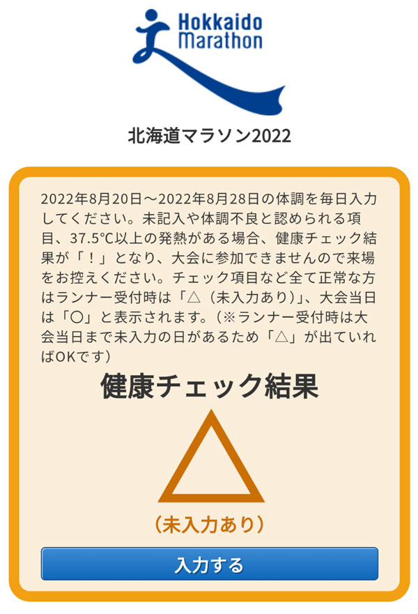 コロナ対策として今回の北海道マラソンでは8日前の8月20日(土)からネットで健康チェック(&体温)を入力し、それを受け付け時に提示(スマホ提示orプリントアウト)する方法でした。
