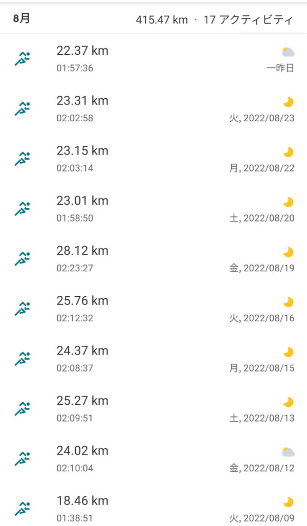 今年2022年僕がどれだけ走って本番(北海道マラソン2022)を迎えたかというと以下の通りで、8月までに3,338km(約417km/月平均)、直前の8月は415km走りました。