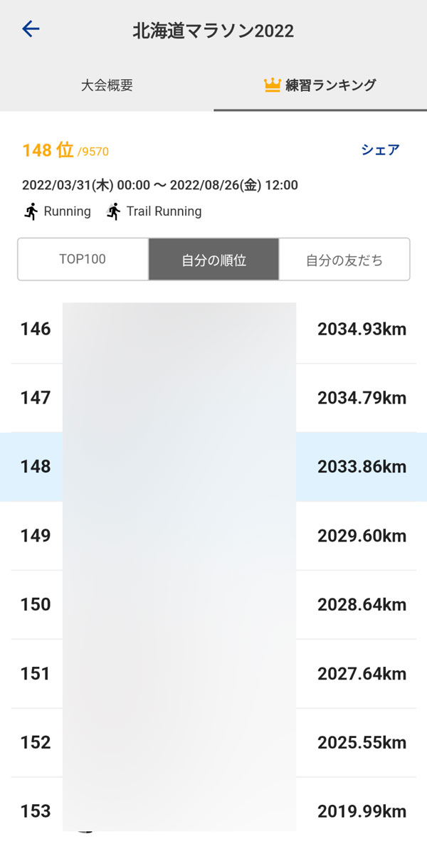 今回の北海道マラソン2022の練習ランキング(2022年3月31日~8月26日)では約9,500人が参加し、僕は148位でした!