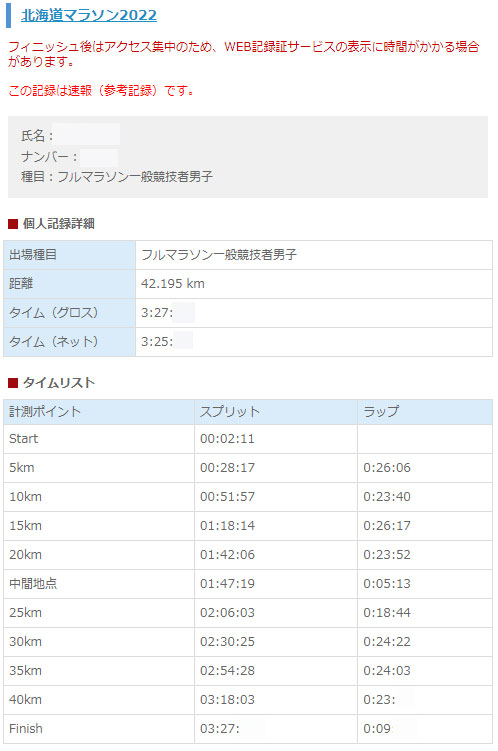 | ネットタイム(スタートラインからのtime) | 3時間25分○秒 | ||||