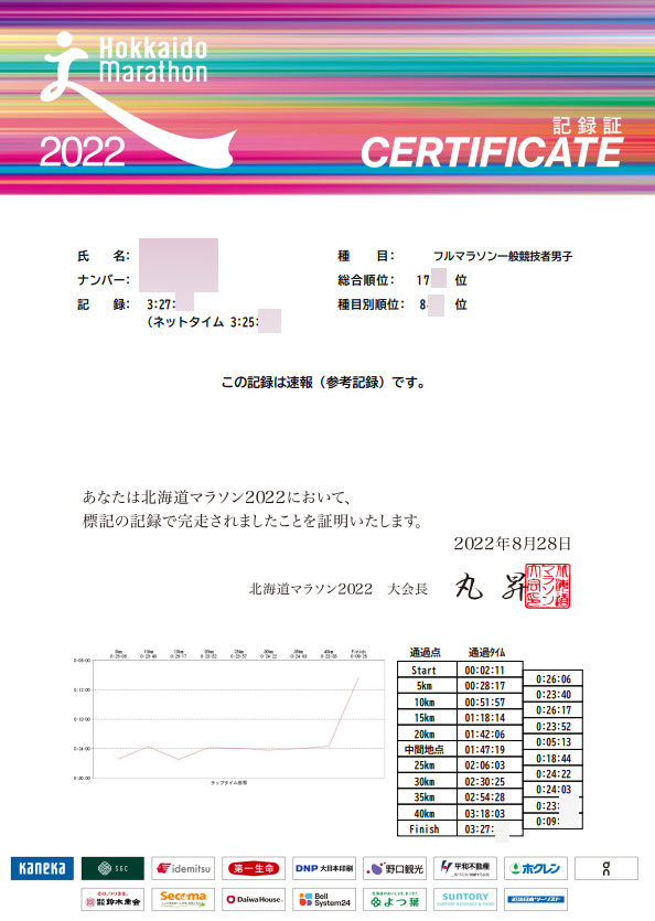 フルマラソンの自己ベストはおかやまマラソン2019の3時間40分台(ネットタイム)だったけど、結果は自己ベストの3時間27分台(グロスタイム)!ネットタイムは3時間25分台!目標のサブ3.5を達成!